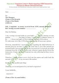 My transaction no 5459 but bank give me letter of no excess cash transaction no 5457 it s mean why atm machine not keep complaint register in same case. Complaint letter to bank during the process of withdrawal of money from atm if the cash was not received from the atm machine but the amount got deducted from your bank account and subsequently you did not even receive any message from bank regarding reversal of money back to your account then you should. Amount to the account debited.